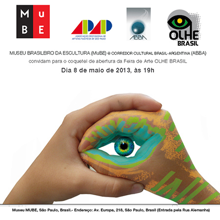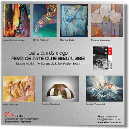 2013 – Museo de escultura MuBE "Olhe Brasil" (San Pablo, Brasil) La primera edición de la FERIA DE ARTE OLHE BRASIL fomentará el mercado nacional e internacional de obras de arte en América Latina. Las galerías de ABBA (www.arteargentinabrasil.com.ar), Buenos Aires Fine Arts, Fundação Torres Aguero-Rozanés, Milo Locket y la Galeria 22, de Brasil, más 17 artistas de Argentina, Brasil, Chile y Venezuela mostrarán sus obras de arte moderno y contemporáneo para su comercialización en el evento que se desarrolla en el MuBE, Museo Brasileño de Escultura. 2013 – Museum of sculpture MuBE "Olhe Brasil" (San Pablo, Brazil) The first edition of FERIA DE ARTE OLHE BRASIL will encourage national and international market of works of art in Latin America. Abba galeries (www.arteargentinabrasil.com.ar), Buenos Aires Fine Arts, Fundação Torres Aguero-Rozanés, Milo Locket and Galeria 22, from Brasil, together with over 17 artists from Argentina, Brasil, Chile and Venezuela will show their modern and contemporary art on sale during the event at MuBE, Brazilian Museum od Sculpture. |